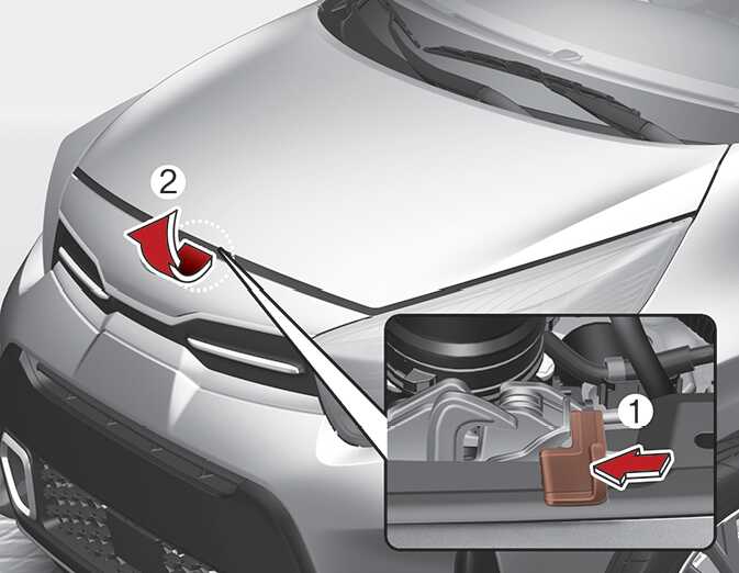 차의 앞에서 엔진 후드를 약간 들어 올리고, 중앙 안쪽의 잠금레버(1)를 왼쪽으로 밀어 올린 상태에서 후드(2)를 위로 들어 올리십시오.