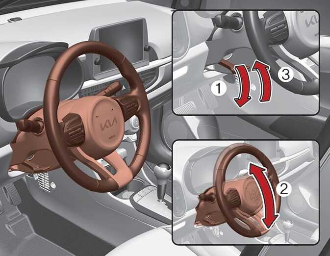 높이를 조절할 때는 조절 레버를 앞으로 당긴 상태(1)에서 스티어링 휠을 상하(2)로 움직여 위치를 결정합니다. 조절 후에는 조절 레버를 원위치(3)시킨 다음 스티어링 휠을 흔들어 확실하게 고정되었는지 확인하십시오.