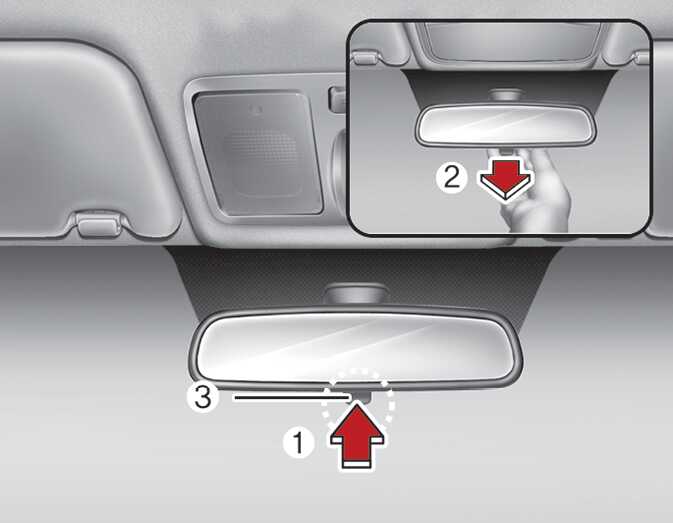야간 주행 시 주·야 변환레버(3)를 운전자 방향으로 당기면 뒤 차량의 전조등 불빛으로 인한 눈부심을 줄일 수 있습니다.