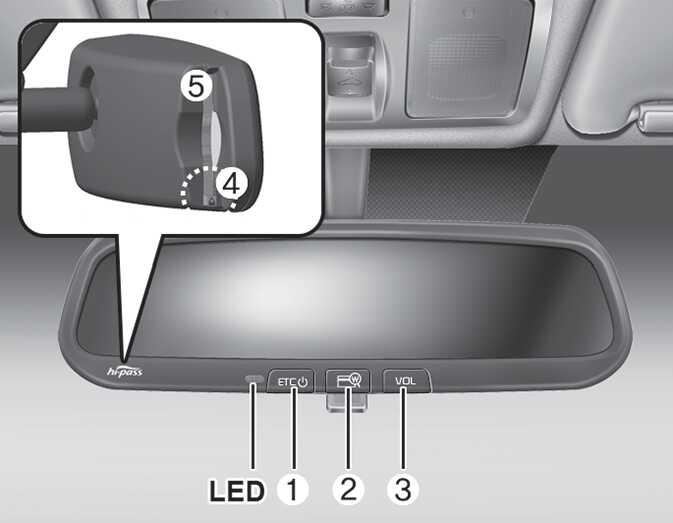 하이패스 차로를 통과할 때는 하이패스 미러 전원 스위치가 켜진 상태로 운전하십시오. 전원이 꺼진 상태로 통과하면 통행료가 결제되지 않습니다.