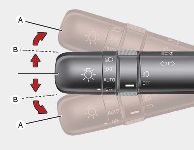 우측 방향을 표시하려면 조명 스위치를 위로, 좌측 방향을 표시하려면 아래로 움직이십시오.(A)