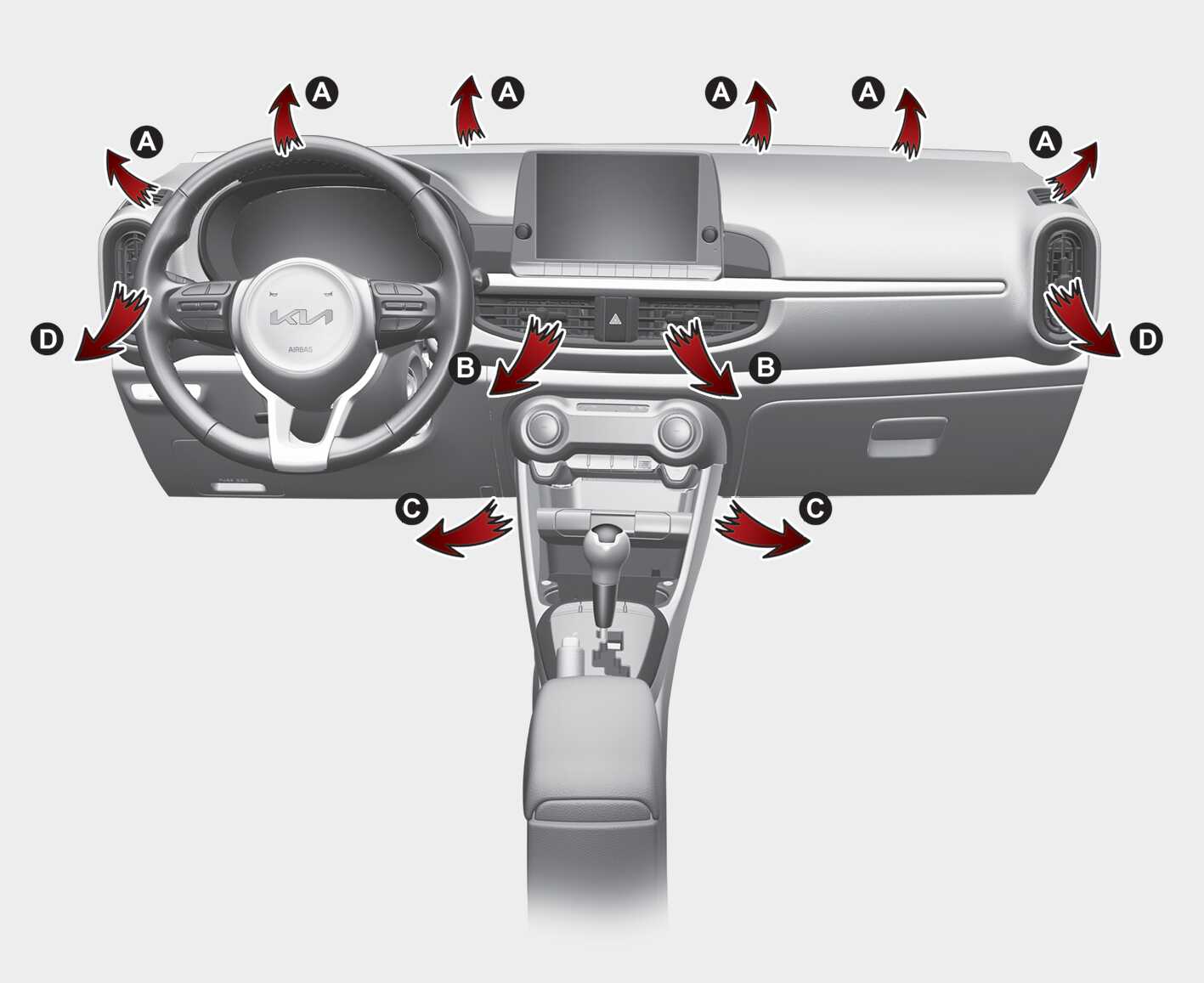 주로 발끝으로 바람이 나오게 할 때 사용합니다.(일반적으로 난방을 할 때의 위치입니다.)앞유리 습기 발생 예방 차원에서 (A), (D)방향에서도 약간의 바람이 나옵니다. |