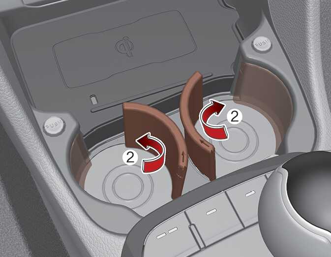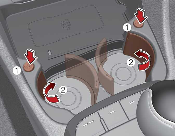소물함으로 사용하기 위해서는 컵 홀더(2)를 화살표 방향으로 돌려 고정하십시오.