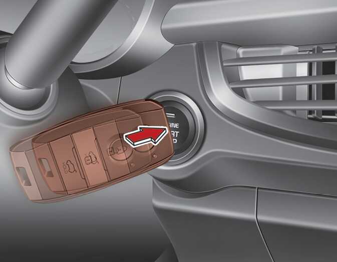 스마트키의 배터리가 방전되거나 전자기기에 의한 전파방해로 시동이 걸리지 않는 경우 스마트키로 시동 버튼을 직접 누르십시오.