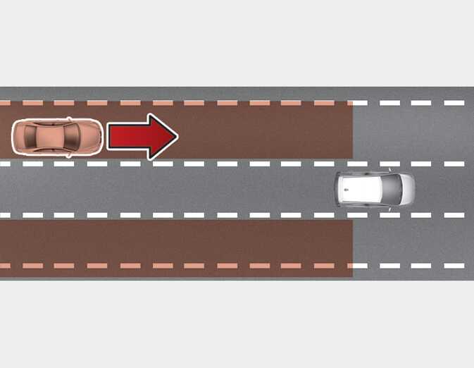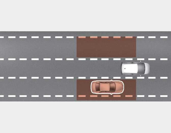 경고 영역은 자차의 속도에 따라 변경됩니다. 단, 사각 지대에 차량이 있더라도 자차가 빠른 속도로 추월할 경우 경고를 하지 않습니다.