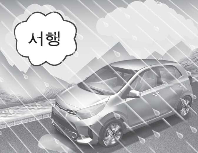 폭우가 내릴 때는 시야를 확보하기가 더 어려워 제동 거리가 더 많이 필요하므로 천천히 운행하십시오.