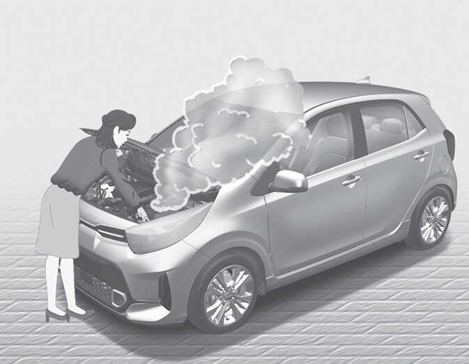 냉각수나 뜨거운 증기가 냉각수 탱크에서 흘러나오면, 엔진을 정지시키고 자사 직영 서비스센터 또는 서비스협력사에 연락하십시오.