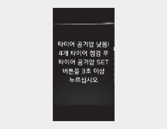 저압 타이어로 계속 운전하면 타이어가 과열되어 파손될 수 있습니다. 또한 타이어 수명, 차량 조작능력, 브레이크 제동력, 연비가 떨어지며, 차량을 불안정하게 할 수 있습니다. 반드시 자사 직영서비스센터 또는 서비스협력사에 의뢰하여 적정 공기압을 유지하십시오.