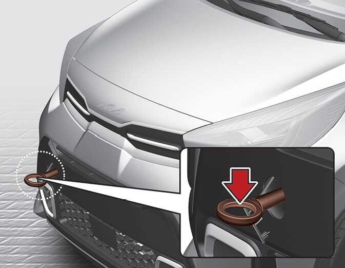 바퀴가 진흙, 모래 또는 차량 자체의 힘으로는 빠져 나올 수 없는 상태일 경우 비상 견인 고리를 이용하여 차량을 견인하지 마십시오.