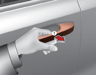 (터치센서 타입의 경우) 도어 핸들 포켓(1) 안에 손을 넣어 바깥 손잡이 안쪽에 위치한 도어 잠금 해제 센서부를 터치하십시오.