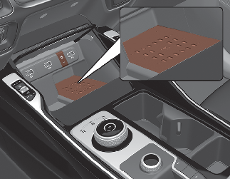 중앙 콘솔 앞쪽에 휴대폰 무선충전을 위한 시스템이 적용되어 있습니다. 휴대폰을 충전하기 위해서는 차량의 도어를 모두 닫고, 시동 버튼 「ON」 상태에서 무선 충전이 지원되는 휴대폰을 충전패드 위에 올려 놓으면 충전 가능합니다.
