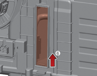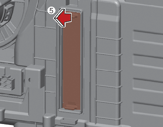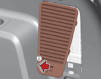 트렁크룸 우측에 있는 후석 에어컨 전용 에어필터 커버의 후크(1)를 위로 밀어 누르십시오. 이 상태에서 커버를 앞으로 당겨 분리하십시오(2).