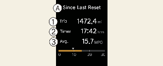 This display shows the accumulated trip distance (1), the average fuel efficiency (2), and the total driving time (3).