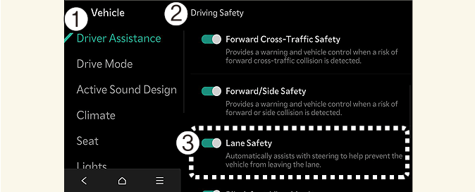 Con il veicolo acceso, selezionare Impostazioni → Veicolo → Assistenza alla guida → Sicurezza di guida nel sistema di infotainment.