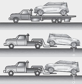Wenn in einem Notfall Abschleppen erforderlich ist, wird empfohlen, dies von einem Kia Vertragshändler oder einem gewerblichen Abschleppdienst machen zu lassen. Um Schäden am Fahrzeug zu vermeiden, müssen geeignete und fachgerechte Abschleppverfahren angewendet werden. Es wird empfohlen, Nachläufer (1) oder einen Pritschenwagen zu verwenden.