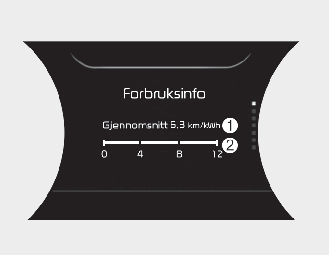 Den gjennomsnittlige energiforbruket er beregnet på den totale kjørestrekningen og høyspennngsbatteriforbruket siden siste tilbakestilling av gjennomsnittlig energiforbruk.