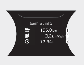 Dette displayet viser akkumulert turlengde (1), gjennomsnittlig energiforbruk (2), og total kjøretid (3).