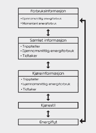 Elbilsystemet informerer føreren om energistrømmen i ulike driftsmoduser. Den gjeldende energiflyten er spesifisert i tre moduser under kjøring.