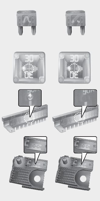 Hvis den nye sikringen ryker, kan det ha oppstått et elektrisk problem. Unngå å bruke det aktuelle systemet, og rådfør deg umiddelbart med et profesjonelt verksted. Kia anbefaler at du rådfører deg med en godkjent Kia-forhandler/servicepartner.