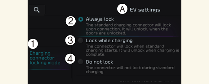 Odaberite Postavke → Vozilo → ECO Vozilo → Način zaključavanja priključka za punjenje na informacijsko-zabavnom sustavu.
