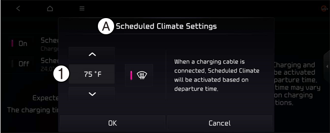 If the target temperature (1) is set with the cable connected, the cabin temperature will be adjusted to the target temperature at departure time. In cold weather, pre-scheduled heating helps enhance electric vehicle performance by heating the vehicle in advance.