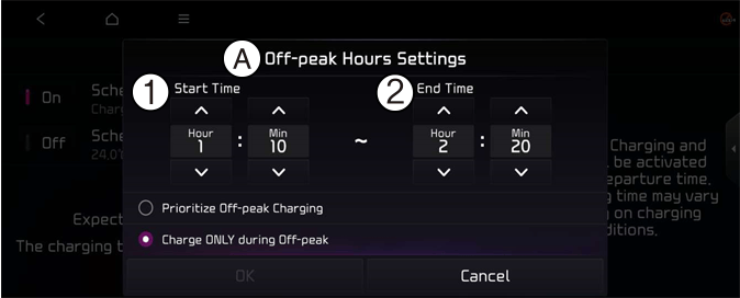 1. If selected, starts charging only on the designated off-peak time. If deselected, starts charging only on the scheduled time.