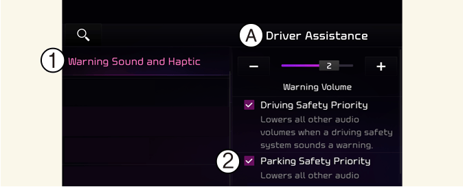 If not equipped with the navigation system, select User Settings → Driver Assistance to adjust the Warning Volume.
