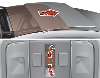 Ovládací spínač střešního okna posuňte směrem dozadu do polohy první západky, sklo střešního okna se bude otevírat. Pokud je však elektrická sluneční clona zavřená, nejprve se otevře sluneční clona. Ovládací spínač střešního okna posuňte směrem dopředu do polohy první západky, sklo střešního okna se bude zavírat. Je-li však střešní okno zavřené, zavře se elektrická sluneční clona.