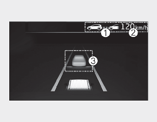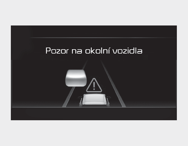 V následující situaci se na přístrojovém panelu zobrazí varovná zpráva „Watch for surrounding vehicles“ (Sledujte okolní vozidla) a zazní zvukový signál jako výstraha pro řidiče ohledně dopravní situaci před ním.