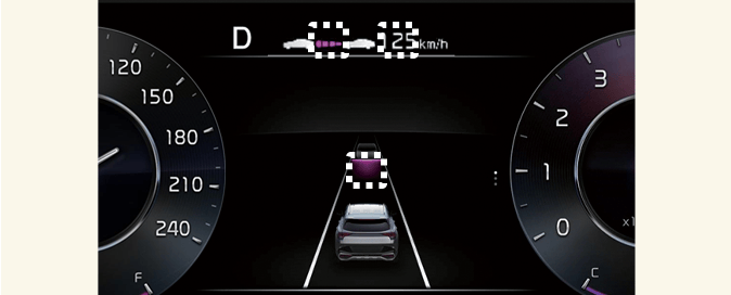 Zobrazuje se, zda se před vámi nachází jiné vozidlo, a cílový odstup.