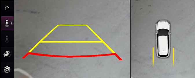 Je-li vybráno Navádění při parkování s pohledem z nadhledu, zobrazí se na pravé straně obrazovky Systému zobrazování okolí navádění při parkování.