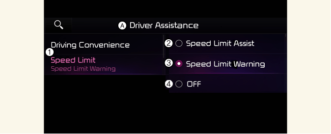 Pokud je zvolen asistent pro rychlostní omezení Asistent rychlostních limitů, Inteligentní asistent pro rychlostní omezení řidiče informuje o rychlostním limitu a dalších silničních značkách. Chytrý asistent pro rychlostní omezení navíc informuje řidiče o změně nastavené rychlosti manuálního asistenta pro rychlostní omezení a/nebo adaptivního tempomatu (je-li součástí výbavy) jako pomoc pro udržení rychlosti jízdy ve stanoveném rychlostním omezení.