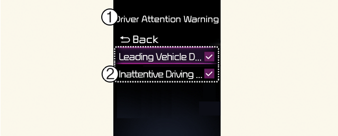 V zapnutém vozidle vyberte možnosti Uživatelská nastavení → Jízdní asistent → Varování systému sledování bdělosti řidiče na přístrojové desce nebo vyberte možnosti Nastavení → Vozidlo → Jízdní asistent → Varování systému sledování bdělosti řidiče v informačním systému, abyste určili, zda chcete používat jednotlivé funkce, či nikoli.