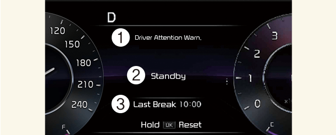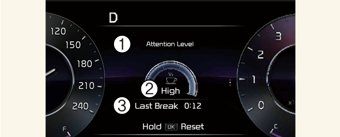 Úroveň pozornosti řidiče se zobrazuje na stupnici 1 až 5. Nižší hodnota znamená nižší míru pozornosti řidiče. Pokud si řidič po určité době řízení neudělá přestávku, hodnota se snižuje.