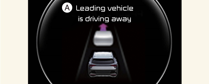 Když se stojící vozidlo vpředu začne rozjíždět, funkce upozornění na rozjetí vozidla vpředu řidiče upozorní zobrazením zprávy na přístrojovém panelu a zazní zvuková výstraha.