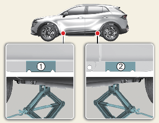 Umístěte zvedák vpředu (1) nebo vzadu (2) na určenou pozici pro zvedání.