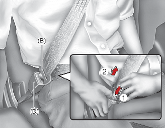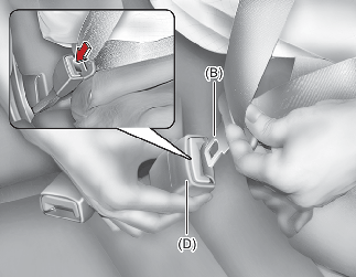 플레이트(B)를 잡고 벨트를 당기십시오. 플레이트(B)를 “찰칵” 소리가 날 때까지 버클(D)에 밀어 넣으십시오. 벨트가 꼬이지 않았는지 확인하십시오.