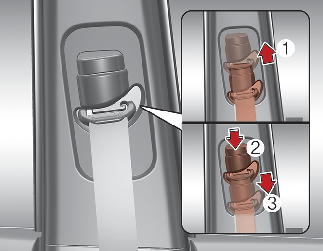 벨트의 높이를 낮추려면, 고정 장치를 잡고 잠금 버튼을 누른 상태(2)에서 밑으로 내리십시오(3).