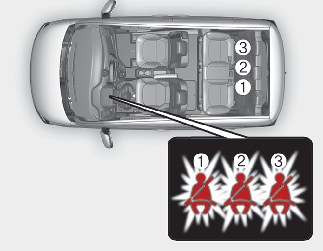 동승석 안전벨트를 착용하지 않았거나 착용한 후 주행 중 안전벨트를 풀면 차량의 속도가 20 km/h 미만일 때는 경고등이 켜지며, 차량의 속도가 20 km/h 이상일 때는 경고등이 깜빡이고 경고음이 100초 동안 울립니다.