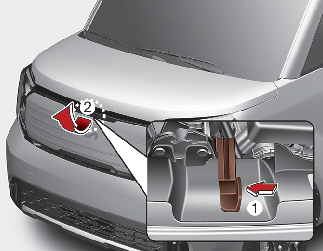 차량의 앞에서 엔진 후드를 약간 들어 올리고, 중앙에 있는 잠금 레버(1)를 왼쪽으로 밀고 있는 상태에서 후드(2)를 위로 들어 올리십시오.