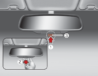 야간 주행 시 주야 변환 레버(3)를 운전자 방향으로 당기면 뒷차량의 전조등 불빛으로 인한 눈부심을 줄일 수 있습니다.