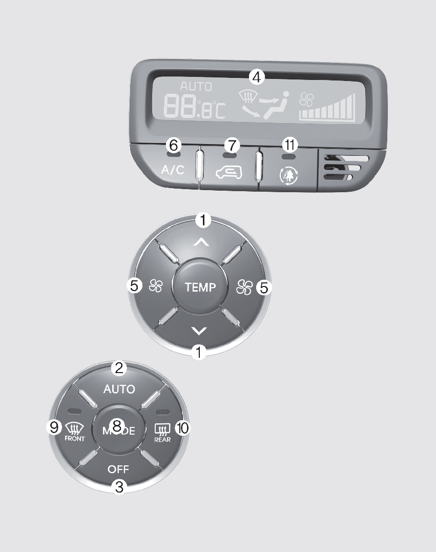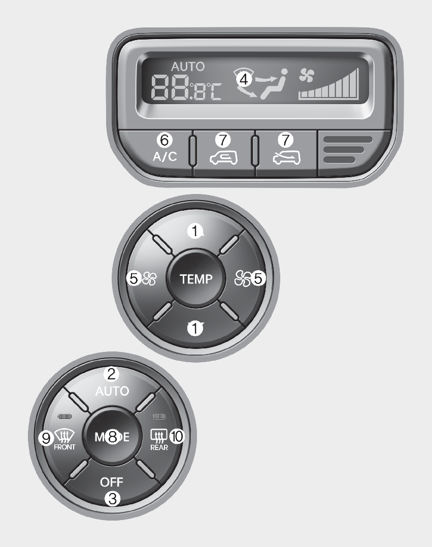 엔진 시동이 걸리지 않은 시동 「ON」 상태에서도 히터/에어컨을 작동할 수는 있지만 냉방/난방 성능이 엔진 시동 상태보다 떨어질 뿐만 아니라 배터리가 빨리 방전될 수 있으므로 반드시 엔진 시동 상태에서 작동하십시오.