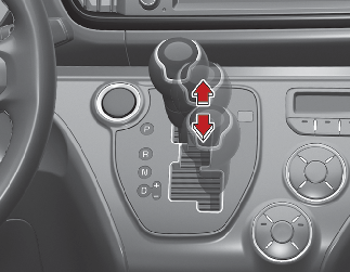 자동변속기는 변속 레버의 위치, 차량속도, 가속 페달의 위치에 따라 1~4속까지 자동으로 변속됩니다. 변속 레버의 위치는 클러스터에 표시됩니다. 「D」, 「R」 및 스포츠 모드 구간(+, -) 위치에서는 가속페달을 밟지 않아도 브레이크만 풀면 차가 전진하거나 후진합니다. 이 위치에서 차를 멈추려면 반드시 브레이크 페달을 밟으십시오.