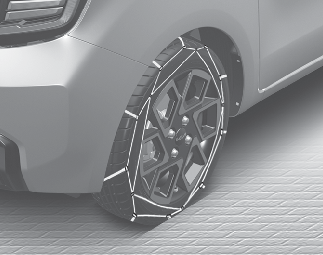 체인을 장착한 후에는 천천히 운행하십시오. 체인이 차체나 섀시에 닿는 소리가 들리면 즉시 차를 멈추고 체인을 조이십시오. 소리가 나지 않을 때까지 감속하고 눈이 없는 도로 주행 시에는 바로 체인을 풀어 체인이 손상되지 않도록 주의하십시오.