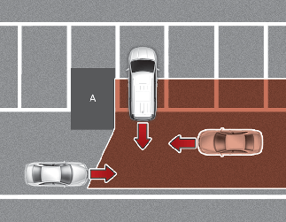 사선으로 주차된 상태에서 후진으로 출차할 경우 후측방에서 접근하는 차량을 인식하지 못해 후방 교차 충돌방지 보조가 경고하지 않거나 제동을 도와주지 않을 수 있습니다.