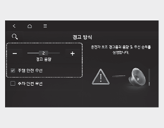 주행 안전 우선: 인포테인먼트 시스템의 설정 → 차량 → 운전자 보조 → 경고 방식 → 주행 안전 우선을 설정하면 안전한 주행을 위해 경고음 발생 시 오디오 음량을 줄입니다.