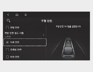 시동 ‘ON’ 상태에서 클러스터의 설정 → 운전자 보조 → 주행 안전 또는 인포테인먼트 시스템의 설정 → 차량 → 운전자 보조 → 주행 안전을 차례로 선택하십시오. 각 기능의 사용 여부를 선택할 수 있습니다.