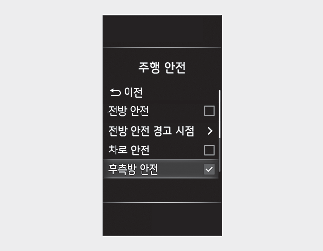 시동 ‘ON’ 상태에서 클러스터의 설정 → 운전자 보조 → 주행 안전 → 후측방 안전 또는 인포테인먼트 시스템의 설정 → 차량 → 운전자 보조 → 주행 안전 → 후측방 안전을 차례로 선택하십시오. 각 기능의 사용 여부를 설정할 수 있습니다.