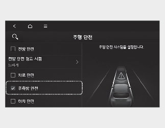 주행 안전 우선: 인포테인먼트 시스템의 설정 → 차량 → 운전자 보조 → 경고 방식 → 주행 안전 우선을 설정하면 안전한 주행을 위해 경고음 발생 시 오디오 음량을 줄입니다.
