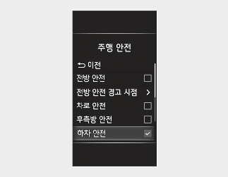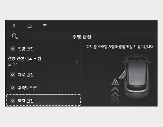 시동 「ON」상태에서 클러스터의 사용자 설정 → 운전자 보조 → 주행 안전 → 하차 안전 또는 인포테인먼트 시스템의 설정 → 차량 → 운전자 보조 → 주행 안전 → 하차 안전을 차례로 선택하십시오. 각 기능의 사용 여부를 설정할 수 있습니다.